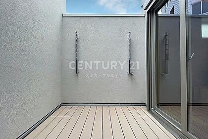 リビングからフラットにつながるウッドデッキバルコニー、壁面が高くなっているためプライバシーを守りながらご家族団欒の時間をお過ごしいただけます。