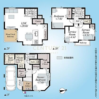 間取図/約20帖のLDKにはウッドデッキバルコニー付き、ウォークインクローゼットやパントリーなど各所に収納豊富ですっきりと暮らせます。3階居室を間仕切ることで4LDKとしてもお使いいただけます。
