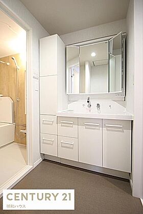 ◎収納たっぷり!三面鏡付シャンプードレッサー新規交換!◎鏡を開くと便利な収納があります!スッキリと片付けられますね!