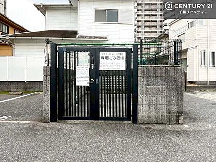 屋根・扉付きのゴミ置き場を完備。猫やカラスに荒らされる心配がなく、雨の日も安心。清潔で管理の行き届いた共用スペースです。