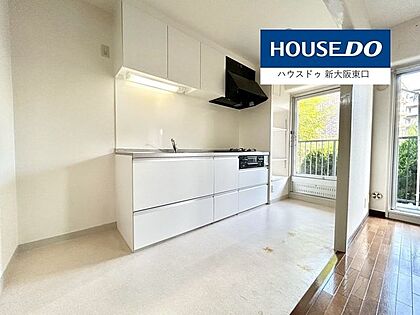三口コンロ・グリル・食器棚付きのシステムキッチン左に冷蔵庫置き場があります。
