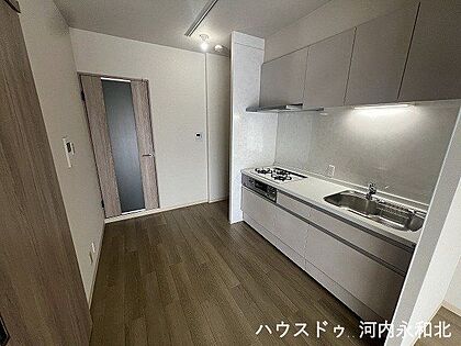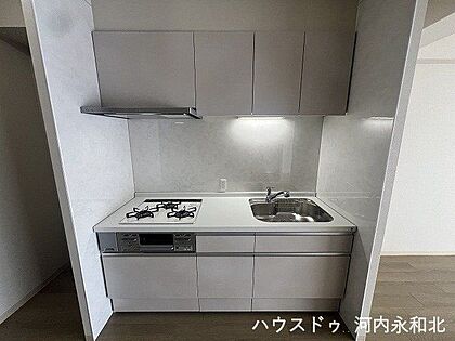 白を基調としたシステムキッチン。上部にも収納があり、調理器具やストックもすっきり片付きます。3口コンロでお料理の効率も上がります。