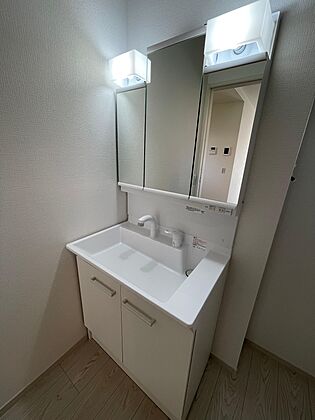 三面鏡の洗面台は鏡の裏が収納になっているため化粧用品がたっぷり入ります♪コンセント付きでドライヤーもすぐに使えます♪