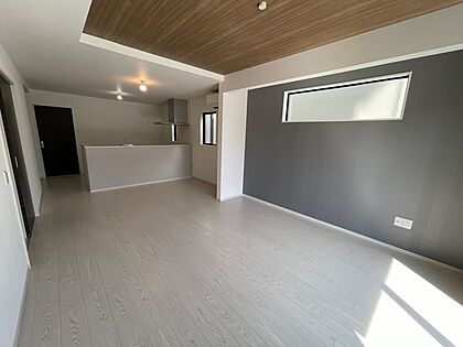 天井が高く開放感を感じるリビング♪彩光とプライバシーを考えた窓の配置でゆったりと家族と団らんできます♪ソファーやローテーブルを置いてもゆとりのある広さです♪