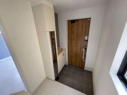 白を基調とした明るい玄関スペース♪シューズクロークは大容量で革靴もスニーカーもたくさん収納可能♪いつもきれいな玄関を保てます♪