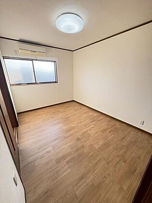 明るい色合いの床が特徴的な洋室です。広々とした空間で収納も充実しています。エアコンも備え付けられており快適に過ごせます。落ち着いた雰囲気でさまざまなインテリアにも合わせやすい内装です。