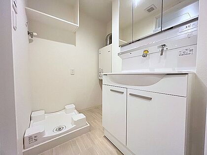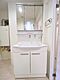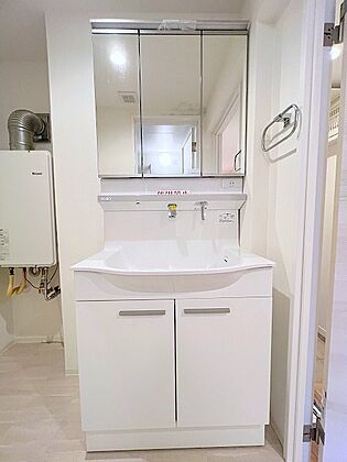 •  収納豊富な三面鏡付洗面化粧台。水回りのあれこれがキレイに収まりそうですね。