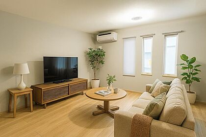 すべての窓が樹脂ペアガラスに付、冬は暖気を逃がしにくく、夏は外の熱を入れにくい!※本画像の家具・インテリアはCG合成です。実際とは異なります。室内(2025年9月)撮影