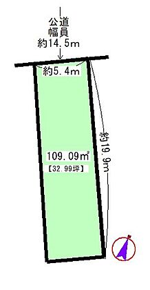 | 土地面積/坪(坪単価) | 109.09m2(登記簿)/33.06坪(45.10万円) | 代表的な接道 | 一方 公道 北 14.5m ※詳細は備考欄をご確認ください |