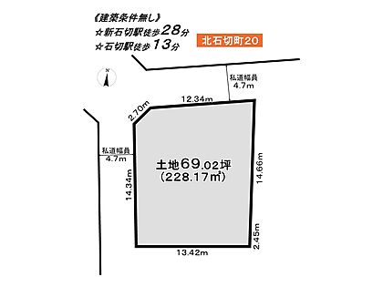 | 土地面積/坪(坪単価) | 228.17m2(実測)/69.14坪(53.20万円) | 代表的な接道 | 角地 私道 北 4.4m、西 4.4m ※詳細は備考欄をご確認ください |