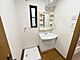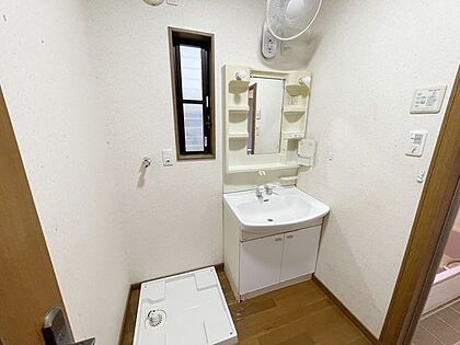 洗面所の様子です。収納がついている洗面台と洗濯機置場がございます。