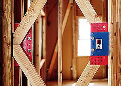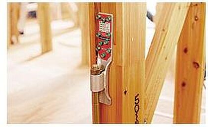 •  構造部材の接合部強化の為、必要部品に性能認定金物を使用し、 耐震性を高める工夫をしています。 地震等により強い引き抜きの力がかかる柱は、基礎に埋め込んだ ホールダウンアンカーを使用して基礎と軸組