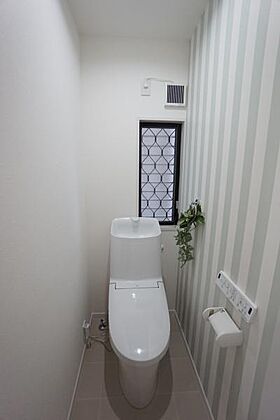 白を基調とした明るく清潔感のある空間。トイレは1階と2階それぞれにございますので、忙しい時や来客の際もスムーズに使うことができて便利です。