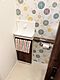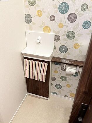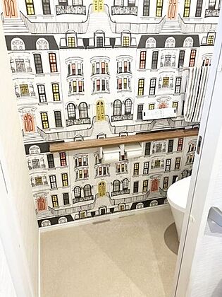 個性的なデザインクロスが目を引くトイレです。壁紙が空間にアクセントを加え明るい雰囲気が魅力です。細部にこだわった内装が印象的です。
