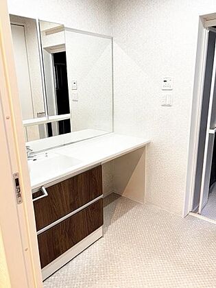 大きな鏡が空間を広く感じさせる洗面所です。シンプルなデザインで清潔感のある雰囲気が魅力です。木目調の収納がナチュラルなアクセントになっています。カウンタースペースも使いやすい印象です。