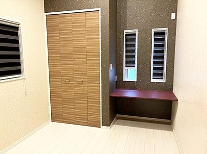 洋室にはナチュラルな木目調扉のクローゼットが備わっています。窓から室内にしっかりと光を取り入れます。ワークスペースとしても活用できるカウンターが設置されています。
