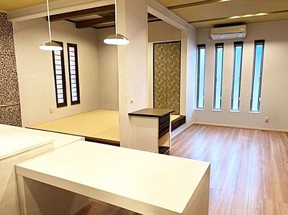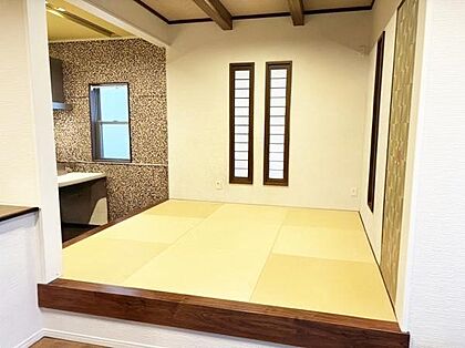 リビング内のタタミコーナーが空間にアクセントを加えています。窓からの採光が室内全体を明るく演出します。フローリングが落ち着いた雰囲気を作り出しています。