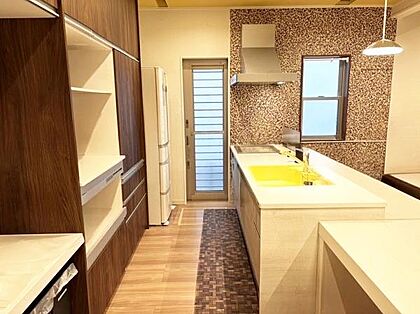 キッチン全体が明るく収納が豊富に配置されています。イエローのシンクがアクセントとなり空間に個性をプラスしています。広々とした作業スペースが確保されており動線もスムーズです。