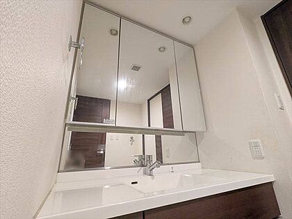 収納豊富な三面鏡付洗面化粧台。水回りのあれこれがキレイに収まりそうですね。