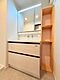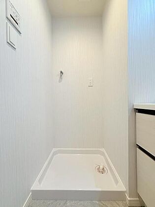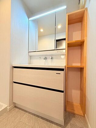 壁付け水栓は水が飛び散ってもお掃除ラクラク!洗面室収納はタオルや着替えを置くスペースに〇