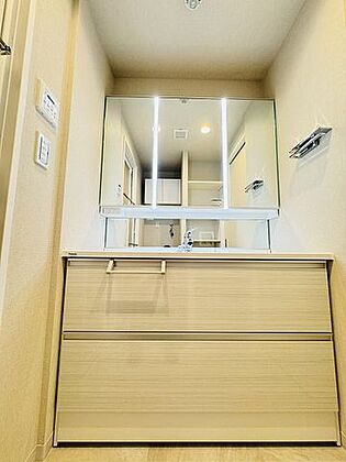 使いやすい三面鏡の洗面台。収納力もあるので、日用品をストックするにも良いですね。
