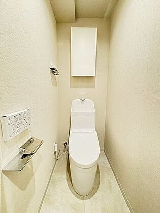 トイレは温水洗浄便座付です。トイレの上部には収納付。トイレットペーパー等、買い置きもしやすそうです。