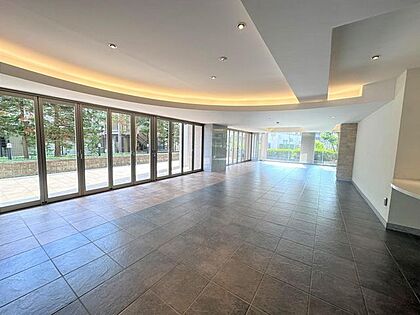 透明感のあるエントランスから眺める、お手入れされた植栽が住まう人の心を和ませる癒しの景色です