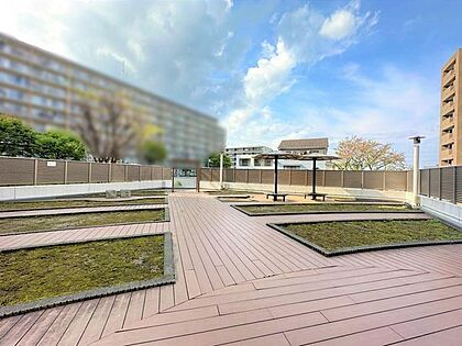 自転車置場の屋根にルーフガーデンを設置。空と緑に癒されるひとときを。