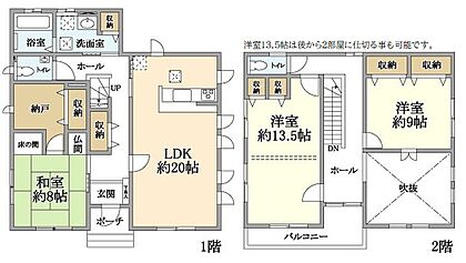 2階13.5帖!出入り口が2か所ある為、2部屋に区切り事も可能です。