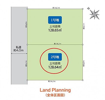 | 土地面積/坪(坪単価) | 128.64m2(実測)/38.98坪(50.80万円) | 代表的な接道 | 一方 私道 北西 4m ※詳細は備考欄をご確認ください |