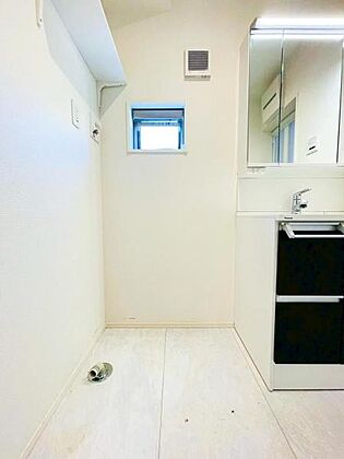 【洗面・脱衣所】ストレスフリーな広いランドリースペース。大きな洗濯機乾燥機もしっかりとおけます。