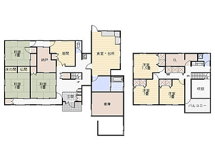 【間取り図】建物面積69坪超!大人数で過ごしてもゆとりある広さで、ゆったりと寛げる住まい。個室が多数設けられており、多世代や複数家族での宿泊にも◎室外から利用できる倉庫も含め、収納も豊富です。