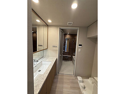 •  【洗面室】ワイドミラー付きの洗面化粧台。忙しい朝も、2人並んでヘアセットなど身支度が可能です。ミラー裏、洗面ボウル下部、吊り戸棚など収納スペースがあり、すっきりと片付けられます。