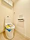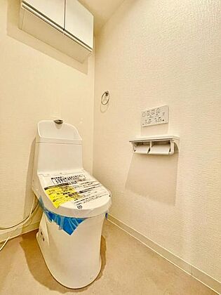 快適なウォシュレット機能付きトイレ!吊戸棚付きで掃除用具やストック品など収納できます