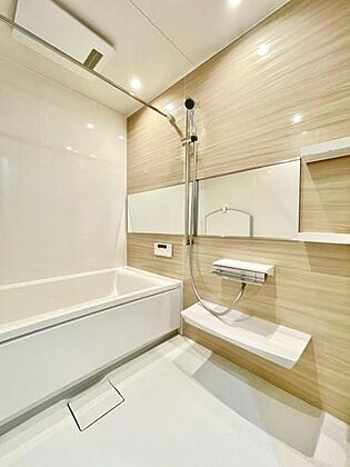 浴室の横長の鏡は、おしゃれで高級感があり、空間を広く見せる効果がありますね