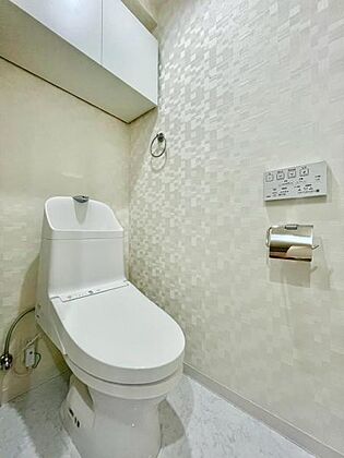 快適なウォシュレット機能付きトイレ!吊戸棚付きで掃除用具やストック品も収納できます