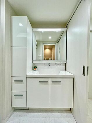 身だしなみチェックもしやすい3面鏡!収納棚付きでスキンケア品もスッキリ収納できます