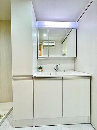 身だしなみチェックもしやすい3面鏡!収納棚付きでスキンケア品もスッキリ収納できます