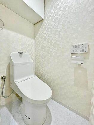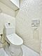 快適なウォシュレット機能付きトイレ!吊戸棚付きで掃除用具やストック品も収納できますね