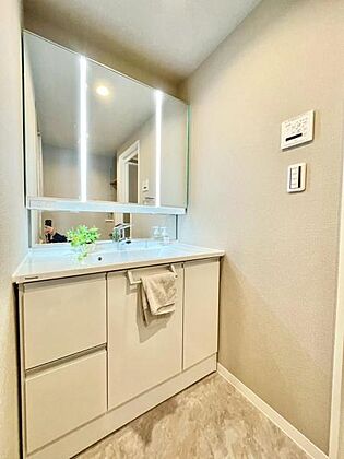 身だしなみチェックもしやすい3面鏡!縦のライン照明がお顔をキレイに映してくれますね