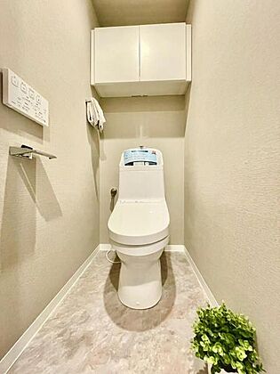 快適なウォシュレット機能付きトイレ!吊戸棚付きで掃除用具やストック品も収納できます