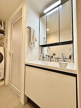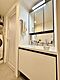 鏡面裏が収納となっており小物もすっきりと収納できる洗面台