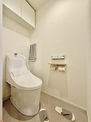 快適なウォシュレット機能付きトイレ!吊戸棚付きで掃除用具やストック品も収納できます