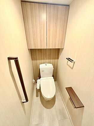 快適なウォシュレット機能付きトイレ!吊戸棚付きで掃除用具やストック品も収納できます