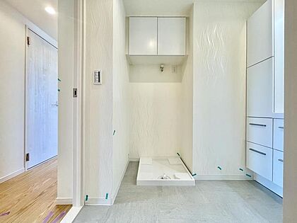 •  【脱衣所】洗濯機置き場の上には収納棚が付いています。バスタオルや洗剤などの収納にも大変便利