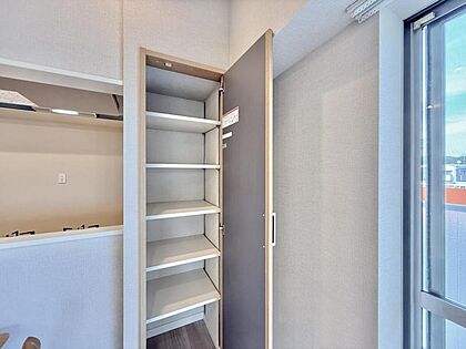 【洗面所】 バスタオルや洗剤などの日常使いの収納にとても便利でな収納棚がついています