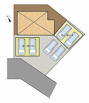 【区画図】お車は計6台駐車可能です。カーポートがついているため雨や雪からお車を守れますね。