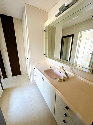 【リフォーム中】脱衣洗面所です。洗面台を新品交換し、壁のクロス張替、照明の新品交換、床はクッションフロア張りを行います。