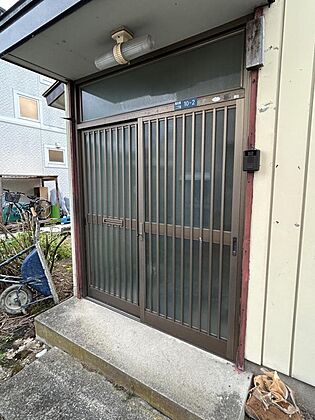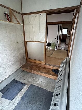 【リフォーム中】玄関。玄関ドアは新品に交換しました。開き戸のスリットから自然光が差し込み、明るい印象の空間になっています。