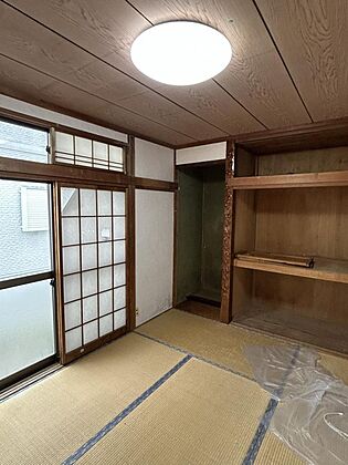 【リフォーム中】南西側約8帖洋室別。和室から洋室へ変更。床フローリング張替え、天井・壁クロス張替え。1帖の押入れにはお客様用の座布団やお布団を収納するだけでなく、衣替え用の衣類も収納でき便利です。